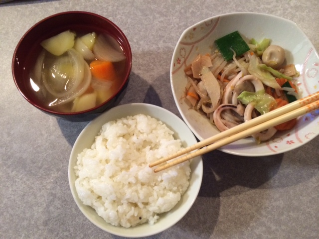 八宝菜風?の、イカと野菜の炒めもの、野菜スープ