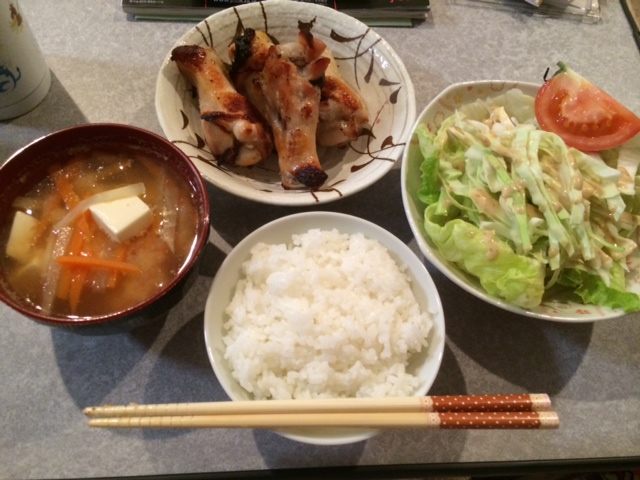 鳥の手羽元を塩麹で焼いたのと、レタスとキャベツとトマトを切っただけのサラダと、大根と人参と豆腐の味噌汁~