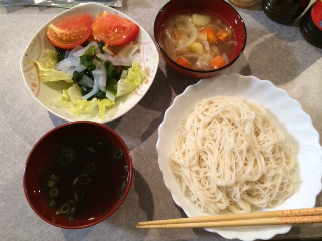付け合わせは海藻サラダ、そしてせっかく涼しげな素麺なのに温かい野菜スープ(^_^;)