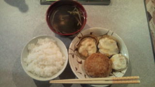 冷凍のハンバーグと、玉ねぎのステーキツナマヨチーズのせ、と昨日と同じスープ