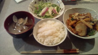 鶏肉ガーリック炒めと、お皿に盛っただけのサラダ、アサリのお味噌汁