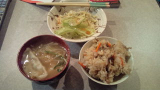 今日は実家からかやくご飯がやってきたので、それプラス、ゆで餃子と野菜のコンソメスープ、そして昨日のサラダ残り~