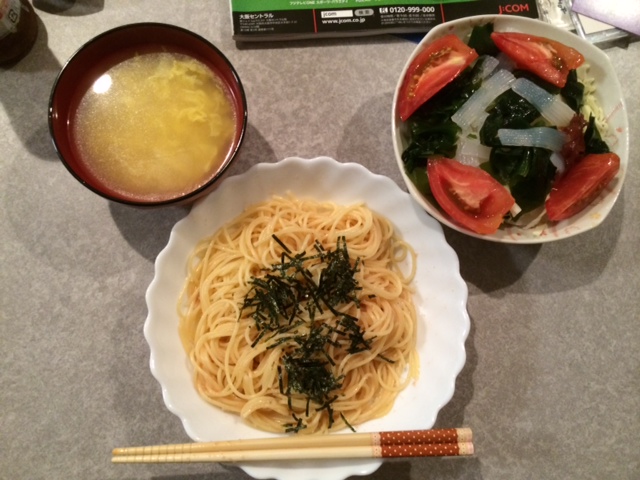 鳥の手羽元を塩麹で焼いたのと、レタスとキャベツとトマトを切っただけのサラダと、大根と人参と豆腐の味噌汁~