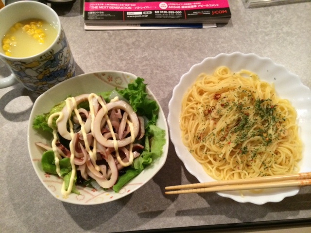 因みに昨日はペペロンチーノパスタと、イカとコンニャクと海藻のサラダでした。