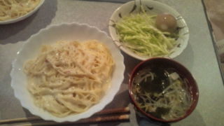カルボナーラと、千切りキャベツ、もやしとワカメのスープ